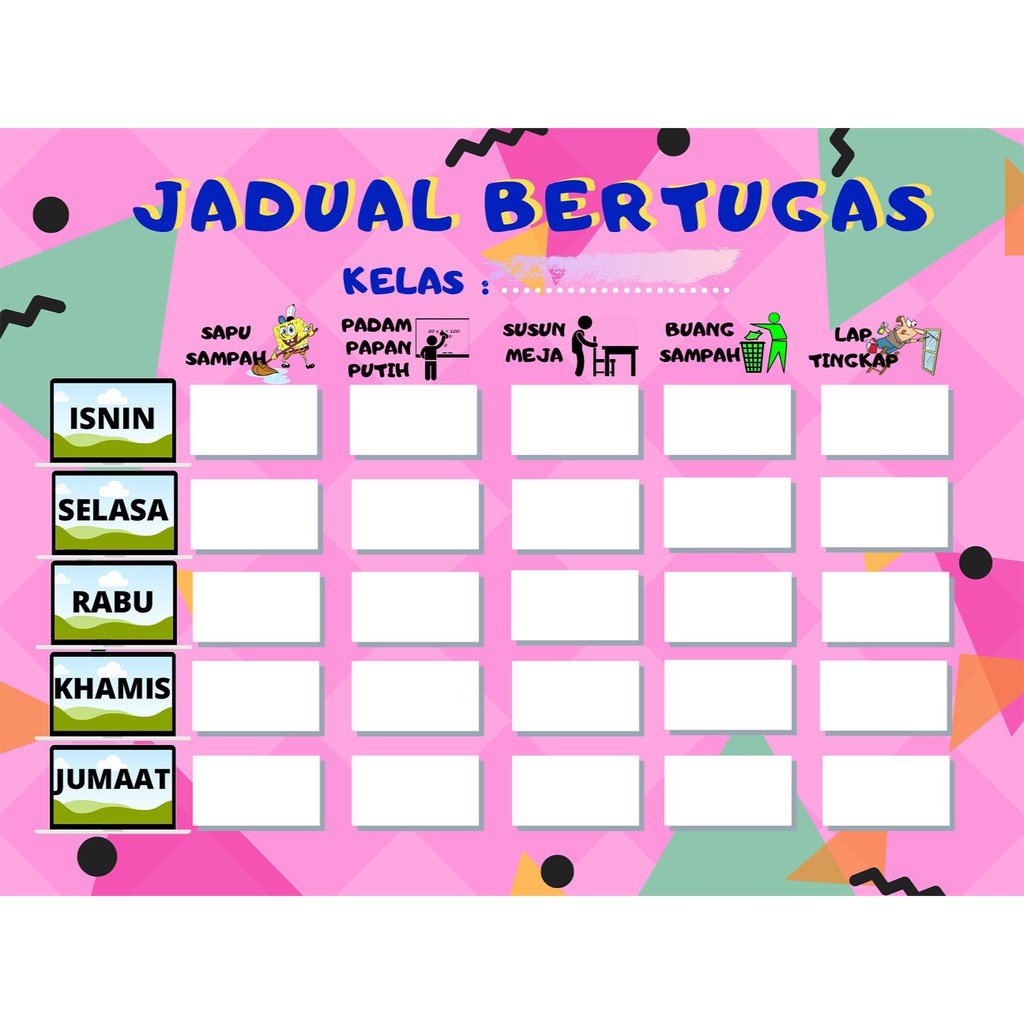 Jadual Bertugas from cf.shopee.com.my Contoh jadual bertugas kelas yang boleh diedit mp3 & mp4. Related image with template jadual bertugas kelas. Ketua kelas bertugas mengatur tata dan struktur kelas wakil ketua bertugas membantu dan menggantikan posisi ketua ketika tidak hadir ke sekolah bendahara bertugas mengelola keuangan umum atau khusus kelas sekretaris bertugas menjadi jubir atau pengganti guru sebagai penulis di. Namun, apa jadinya jika anda ditugaskan untuk membuat jadwal pelajaran untuk seluruh kelas di sekolah? Sekarang ini sudah banyak sekali aplikasi edit foto maupun video yang sudah. Mulai desain dengan beragam template jadwal gratis. See more ideas about insects theme preschool, insects theme, insects preschool. Sesuaikan lebih lanjut jadwal kelas dengan menambahkan sentuhan kreativitas anda.