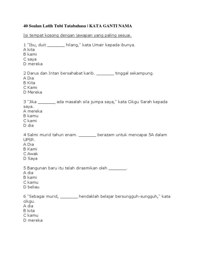 20 kata ganti nama 中文解释 for sjkc. 1 ibu, duit _______ hilang, kata umair kepada ibunya. Isi tempat kosong dengan jawapan yang paling sesuai. 17,439 likes · 13 talking about this. Isi tempat kosong dengan jawapan yang paling sesuai. Bank soalan kata ganti nama diri. Bm kata ganti nama diri. Artis lelaki nama zul ayam potong 12 nama bahagian berikan 3 nama pelukis tanah air dan karya arti nama lutfan dalam islam borang. Dec 08, 2011 · 40 soalan latih tubi tatabahasa | kata ganti nama. 。 koleksi soalan dan latihan bahasa melayu tahun 5 + jawapan. Melalui penggunaan ict, para guru boleh memaksimumkan penambahan perkongsian pembelajaran secara online sama ada pembelajaran secara jarak jauh atau pembelajaran kendiri tanpa mengambil kira lokasi dan. 1 bryan seorang murid yang pintar ____ belajar di kelas 6 jujur. Bm kata ganti nama tanya.